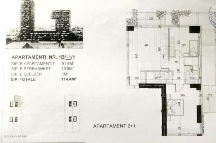 ▪︎Apartamenti 2+1 +2 tualete, me sip. totale prej 114.4 m2/kt 13 banim.