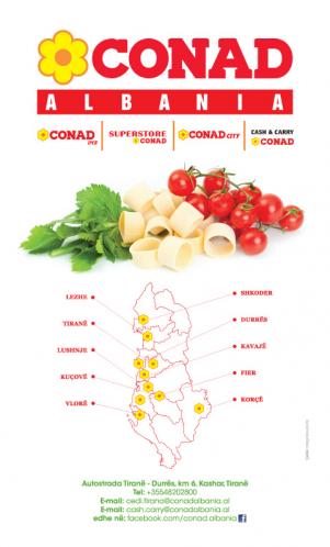 CONAD ALBANIA është rrjeti i vetëm i distribucionit të madh të produkteve Italiane, prodhim për Italinë dhe Bashkimin Evropian. Conad Albania është në zgjerim të vazhdueshëm dhe sot numëron 26 supermarkete dhe një Ipermarket. Cilësia, siguria ushqimore, produktet e shumta dhe të veçanta por dhe çmimet konkuruese prej kohësh identifikojnë Conad Albania si zgjedhjen kryesore të klientëve..